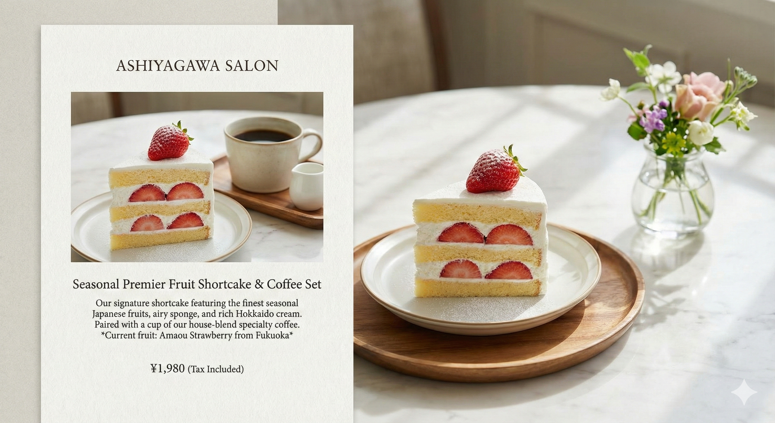 "I am opening a cafe in Ashiya, Japan, featuring a fruit shortcake and coffee set as the signature dish. Use Google Search to identify current cake trends in Ashiya City. Then, create a high-quality menu image for this set that includes a description and price in English, incorporating the local trends."
